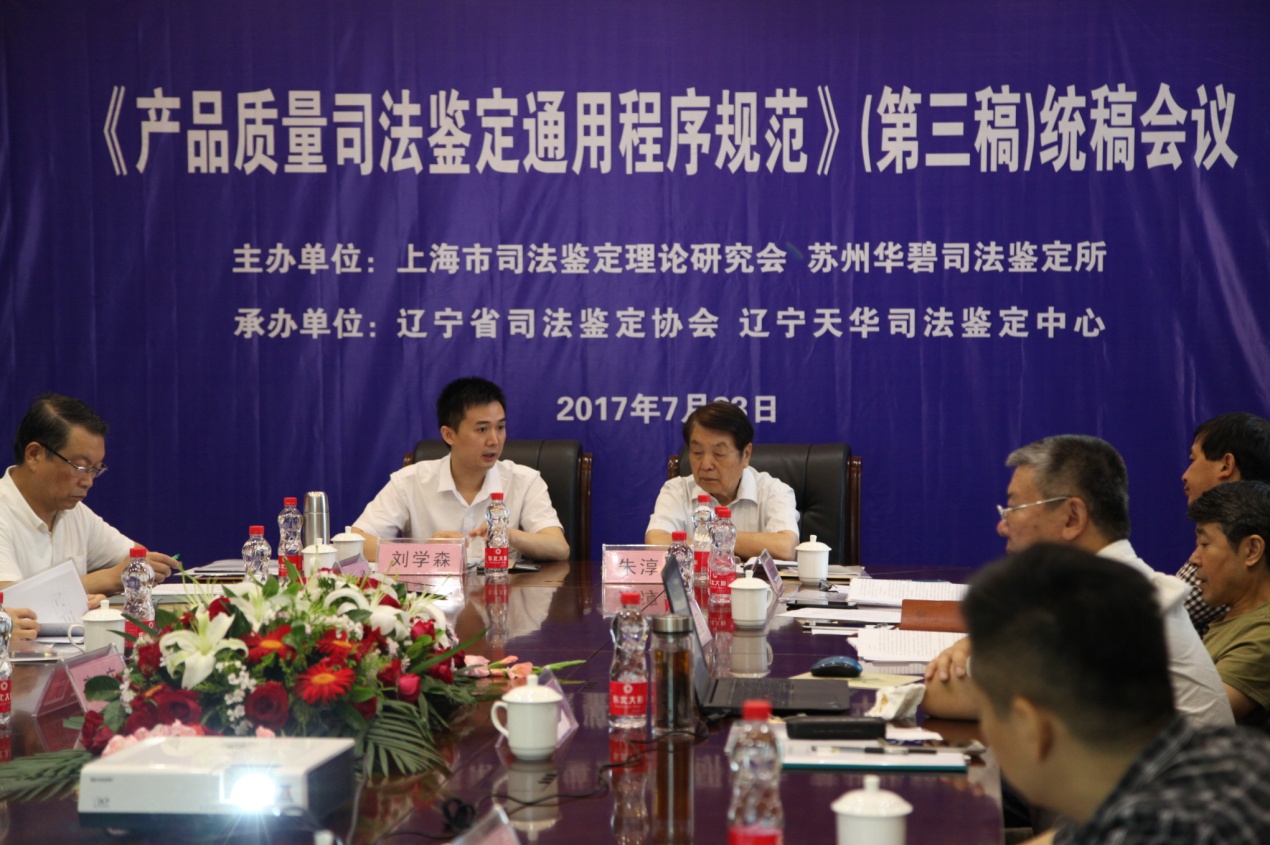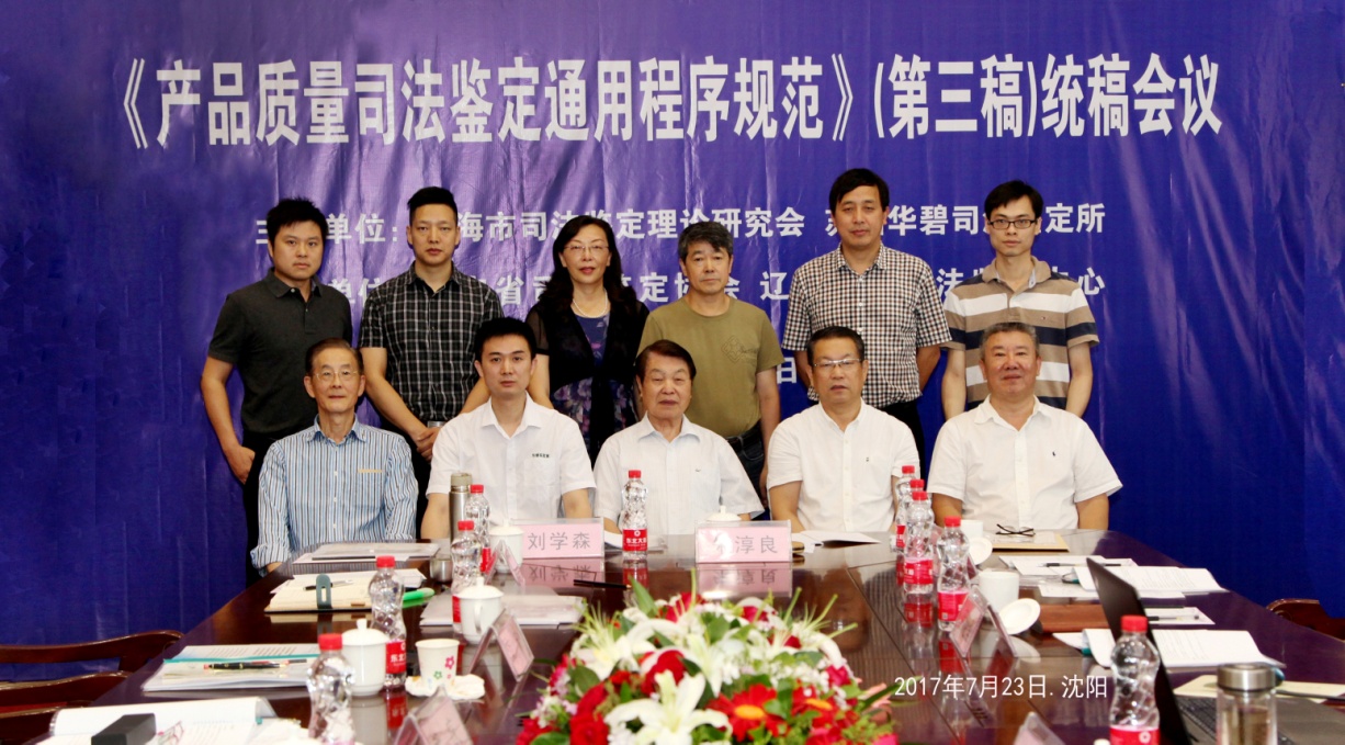 《產品質量司法鑒定通用程序規范(第三稿)》統稿會于7月23日至7月24日在遼寧沈陽召開。遼寧省司法鑒定協會會長韓峰、上海司法鑒定理論研究會秘書長朱淳良、華碧鑒定機構負責人劉學森、蘇州華碧司法鑒定所所長顏景林、蘇州華碧司法鑒定所鄧欽球、山西省機電設計研究院呂迎璽、浙江博智鑒定科學研究院院長吳正鑫、大連產品質量檢驗司法鑒定所武慶、四川省特種設備司法鑒定中心主任李山橋、四川省特種設備司法鑒定中心劉映宇、上海市質量監督檢驗技術研究院機電產品質量檢驗所鄧協和、遼寧天華司法鑒定中心劉陽、遼寧天華司法鑒定中心羅致國等專家出席了會議。