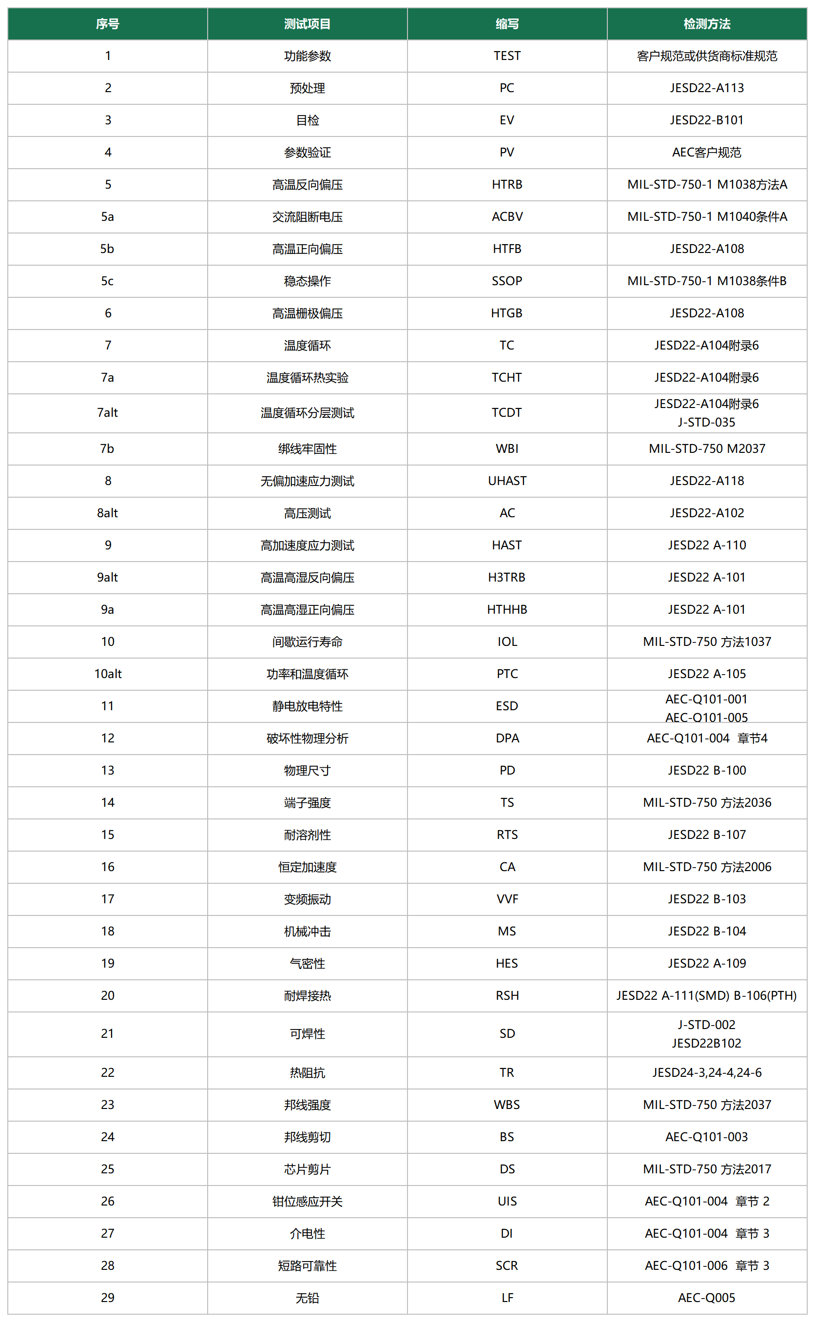 AEC Q101是基于失效機理的離散半導(dǎo)體元件應(yīng)力測試鑒定,由AEC委員會制定,適用于車用離散半導(dǎo)體元件的綜合可靠性測試認(rèn)證標(biāo)準(zhǔn),是離散半導(dǎo)體元件應(yīng)用于汽車領(lǐng)域的基本門檻。首版于1996年發(fā)行,并持續(xù)更新到2021年的E版本,也是目前沿用的* 新標(biāo)準(zhǔn)。AEC Q101標(biāo)準(zhǔn)是離散半導(dǎo)體元件(依產(chǎn)品類型、封裝形貌及取樣數(shù)量的要求)執(zhí)行并通過的必要測試項目。